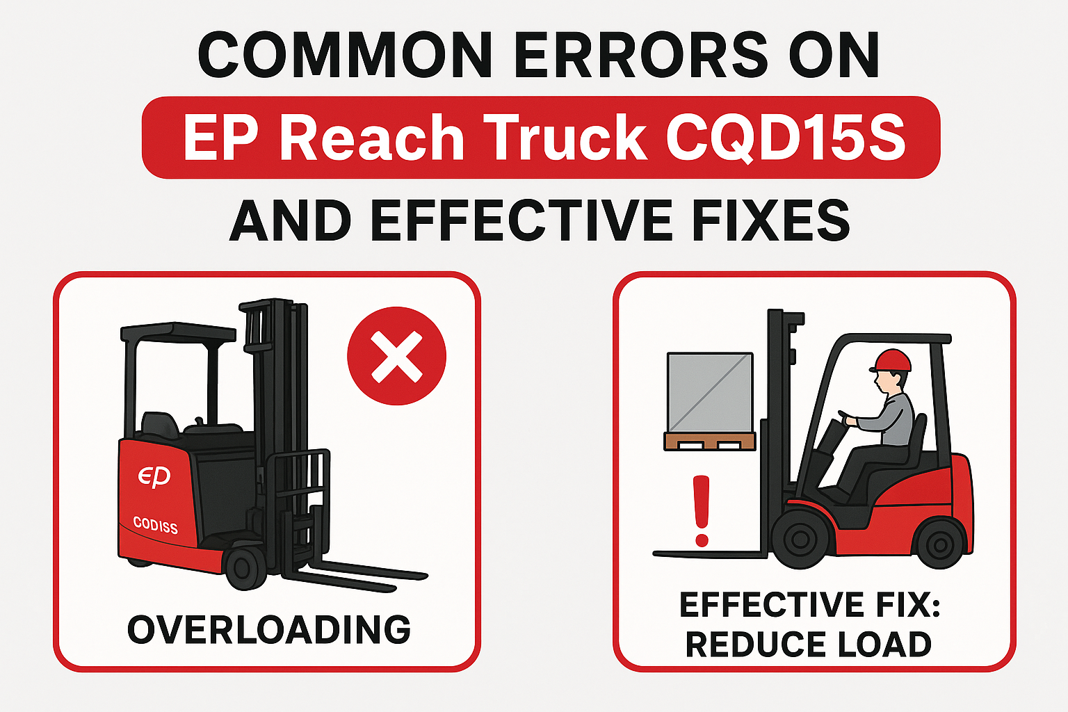 1. EP CQD15S 前移式叉车简介 EP CQD15S 是一款专为窄巷道仓库设计的电动前移式叉车,额定载重 1.5 吨,最高提升高度达 6 米。长期使用后,叉车可能会出现一些常见故障,了解这些问题及其解决办法有助于保持设备高效运行并延长使用寿命。 2. 常见故障及解决方案 2.1. 电气系统与控制故障 [...]